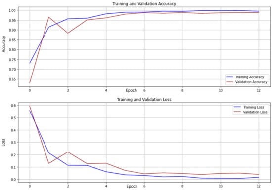 The training dataset consists of 6633 images, out of which 5307 images were used purely for training the model and the rest 1326 files were used in the validation set to tune the model. To optimize the performance of the model and usage of computational resources, we use the ‘Autotune’ option from the Tensorflow library. As noted previously, the ReLU activation functions were used in the Conv2D and Dense layers, and the loss function considered was a sparse-categorical cross-entropy loss. The Adam optimizer was used to compile the model, but it is worth noting that other optimization methods were also tested. The Root Mean Squared Propagation (RMSProp) and Nesterov-accelerated Adaptive Moment Estimation (Nadam) were also explored but the Adam optimizer narrowly outperformed them on the casting data. The training phase was set to run for a maximum of 20 epochs but was completed in 13 epochs. This is due to the inclusion of the early stopping criteria as a safeguard against overfitting []. We use validation loss as the criteria for early stopping, and the execution of the model is interrupted when the validation loss does not improve. The training and validation accuracy along with the training and validation losses have been monitored at the end of each epoch. The plot in Figure 7 shows how the accuracies and the losses of the training and validation set change by epoch.