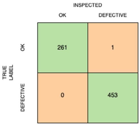 We can also note that there was only one product that erroneously failed inspection when it was actually an acceptable product. If we look at the confusion matrix in Figure 8, we can see the results of the inspection on 715 images of the test set. There are 261 images that are correctly labelled as ‘OK’ (acceptable) and 453 images that are correctly labelled as ‘DEFECTIVE’ (rejected). These are the True Positive and True Negative values, respectively. On the other hand, one image that has a true label of ‘OK’ has been incorrectly classified as ‘DEFECTIVE’, resulting in one False Positive value. No images of ‘DEFECTIVE’ products were incorrectly classified—meaning no False Negative values.