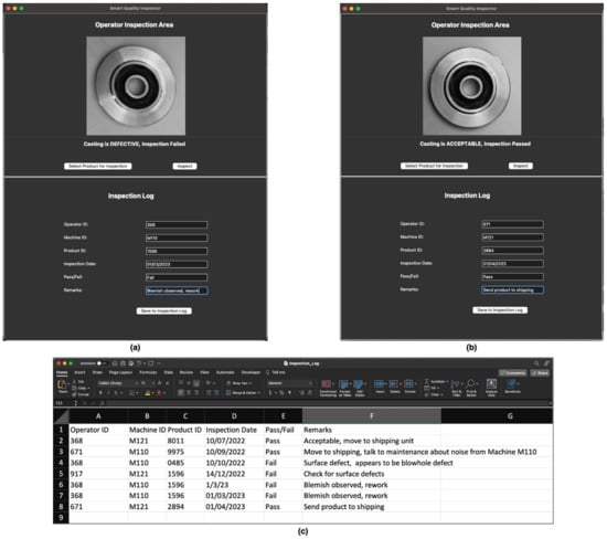 Using the shop floor application for SQI, we can inspect the casting products. To demonstrate the application’s functionalities, we inspect a defective product and an acceptable product. Figure 9a,b shows the results of the inspection of a defective product and an acceptable product, respectively. With a literal click of a button, the product is inspected. The operator is then able to document the inspection process by entering identifying information related to the product, machinery, etc. The information entered is saved in an inspection log in the form of a spreadsheet (see Figure 9c).