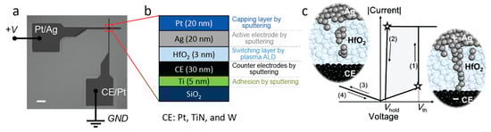 The DM devices were fabricated as micrometer crossbar junctions on a Si wafer with a 430 nm SiO2 layer. A 5 nm thick Ti film from sputtering serves as an adhesion layer between the substrate and CE. For the DM devices with Pt CE, a sputtered Pt film of 30 nm in thickness was used. For the DMs with TiN and W CEs, the bottom electrode was built up from a stack of 10 nm Pt and 20 nm of the respective CE metal. All layers are deposited by the sputtering technique. The 10 nm Pt layer was added to reduce the final resistance of the crossbar-shaped bottom electrode. Next, the bottom electrodes were lithographically patterned and structured by reactive ion beam etching (RIBE). Afterwards, a 3 nm thick HfO2 insulating film was grown on top of the electrodes at 250 °C using a plasma-enhanced atomic layer deposition (PE-ALD) process from tetrakis (ethymethylamino) hafnium (TEMA-Hf) and remote oxygen plasma []. The PE-ALD-grown HfO2 film has a low defect density, enabling the fabrication of DM devices with nanometer-thin switching layers. Afterwards, the top electrode areas were patterned by photolithography. Subsequently, the microstructured top electrodes were obtained from sputter deposition of 20 nm thick Ag active and 20 nm thick Pt capping layers, followed by a conventional liftoff process. Details on the sputtering parameters for the bottom and top electrodes can be found in Appendix A (Table A1). Finally, the bottom electrode contacts are opened using photolithography and RIBE, resulting in the completed crossbar structures with an area of (8.0 ± 0.2) μm2.
