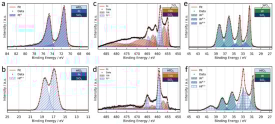 To better understand the formation and properties of the interfacial oxide on the surface of the CE materials used in this work (Pt, TiN, and W), we conducted XPS analysis on samples of these materials with and without the HfO2 layer. XPS is a surface-sensitive analytical technique that allows for the identification and quantification of chemical elements in a sample, as well as the determination of their local valence states. This helps to determine and characterize surface and interfacial oxide layers and discuss the potential impact on the device’s performance. The results from the XPS analysis are shown in Figure 2. First, we investigated the layer stack of 3 nm HfO2/30 nm Pt/SiO2/Si, where the HfO2 film is grown by the PE-ALD process. The analysis of the Pt 4f core-level signal in Figure 2a shows that the Pt layer up to the HfO2/Pt interface is pure Pt metal, as only the Pt0 doublet with Pt 4f7/2 at 71.0 eV is present without any indications about additional valence states. This finding is consistent with the general oxidation behavior of Pt. Moreover, the Hf 4f core-level signal in Figure 2b can be successfully simulated only by the Hf4+ doublet peak with a binding energy of 16.9 eV for the Hf 4f7/2, indicating that the chemical composition of the whole layer is pure HfO2. Therefore, the structure of the DM devices with Pt CE is accurately described by Ag/HfO2/Pt.