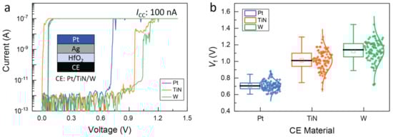 (a) Representative I-V curves of the forming of Ag/3 nm HfO2/CE devices for the three different CE materials Pt, TiN, and W. (b) Box plot displaying forming voltage (Vf) collected from 96 cells for Pt, TiN, and W devices. A compliance current (ICC) of 100 nA and a sweep rate of 6.25 mV/s were used for the measurements.