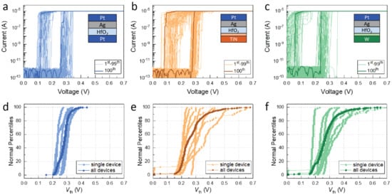 In contrast to the forming process, the threshold switching behavior of the Pt, TiN, and W CE devices is quite similar, as shown in Figure 4a–c. The diagrams show that all three devices switch to the LRS at a threshold voltage (Vth) of approximately 0.2–0.3 V, in an abrupt, volatile, and reproducible manner. This indicates that the devices with Pt, TiN, and W CE have similar switching characteristics once the forming process has been completed. However, the cycle-to-cycle (c2c) and device-to-device (d2d) variations of the Vth values differ for the three types of DMs. Vth values collected from 8 random devices switched for 100 cycles each are plotted for each device in Figure 4d–f. Devices with Pt CE have the least deviation in both c2c and d2d, with only a small spread in the switching behavior. In contrast, those with TiN CE exhibit moderate c2c variation for most devices, but a few outliers display much higher variation. Devices with W CE also show stable switching behavior, but the spread in the c2c and d2d variations is larger than for the other two types of devices.