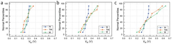 When examining the d2d variation in Vth, the mean Vth is more or less similar for devices with Pt, TiN, and W CE, as shown in Figure 5a. However, when looking at the data from the 90th (Figure 5b) and 97th (Figure 5c) percentiles of the distributions, differences between the three device types become apparent. Devices with Pt CE show a tight distribution almost independent of the selected percentile, while the distributions of the devices with TiN and W CE become less steep and start to deviate more from the mean. Therefore, the effect of the CE material on the switching performance of the DMs derived from continuous I-V loops mainly manifests in larger deviations and increased contributions from outliers.