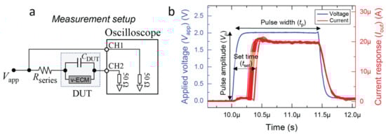 Understanding the switching kinetics of ECMs and how different CE materials affect the kinetics is essential for improving the performance of emerging memristor-based technologies. To that end, the SET time (tset) of all three types of devices was analyzed by using programming pulses with varying pulse amplitude (Vp) and width (tp), ranging from 0.30 to 2.20 V and 1 μs to 1 s, respectively. The data are collected from multiple pulse widths to access the different times across the different voltages, as the minimum rise time is limited for a given tp. However, tp does not have any influence on the SET kinetics []. A minimum rise time of 30 ns was used for the shortest tp. Voltage steps of 0.05 V and time steps of one order of magnitude were used in the analysis. tset is the amount of time it takes for the device to switch to the LRS when a voltage pulse is applied. The measurement setup used in this work is depicted in Figure 6a in the form of a circuitry schematic. Figure 6b shows a typical current response of an Ag/HfO2/Pt device measured using a 2.00 V/1.5 μs programming pulse.
