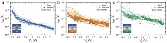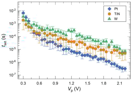 Once data were collected from different Vp and tp combinations, the corresponding tset values were extracted from the transient current response and plotted semi-logarithmic against Vp for the three device types with different CEs (Figure 7a–c). In all cases, it can be seen that tset exponentially decreases with increasing Vp. The highly non-linear characteristic of tset is consistent with previous reports [,]. Examining the median of the data in more detail, differences between the devices with various CEs can be obtained, which depend on the voltage regime. All three kinds of devices show marginal differences in their SET kinetics at low voltages (Figure 8). This observation is in agreement with the results from the I-V sweeps that fit into this regime of low amplitude and large time span. However, as the voltage increases, at around 0.6 V, the curves for the different CE materials begin to diverge from each other, with Pt showing a steep decrease in SET time followed by TiN and W.