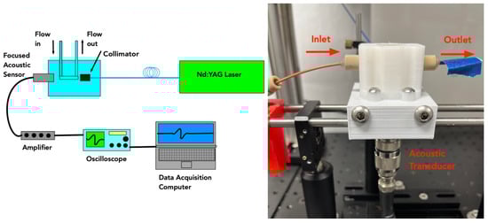 Our photoacoustic testing set up is based on our previously developed system for detection of circulating melanoma and bacterial cells. A schematic of the flow system is displayed below in Figure 1. Laser light at a wavelength of 532 nm and pulse repetition rate of 20 Hz was coupled into a 1000 μm optical fiber with numerical aperture 0.39 (Thorlabs, Newton, NJ, USA) and was used to deliver 5 ns laser pulses directly to our sample. Wavelength of 532 nm was chosen as it is a common laser line that has good absorption in our photoacoustic targets, including the microspheres used in this study. The short pulse duration of 5 ns is necessary to achieve stress confinement for producing robust photoacoustic waves. Laser energy was approximately 2 mJ per pulse out of the optical fiber.
