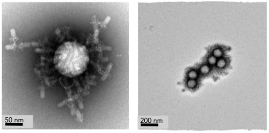 Electron micrographs were taken by Dr. James Conway in the Department of Structural Biology at the University of Pittsburgh. Micrographs were taken on a Thermo Fisher/FEI T12 Spirit using a Gatan US 1000 and Orius CCD camera (Hillsboro, OR, USA). Micrographs were examined to for the presence of contaminating DNA or groEL [], both of which commonly purify with bacteriophage. Tail preparations were found to be of high quality and purity with no observation of contaminating DNA or groEL. Following confirmation of purity, tail preparations were used in later procedures for attachment to microspheres.