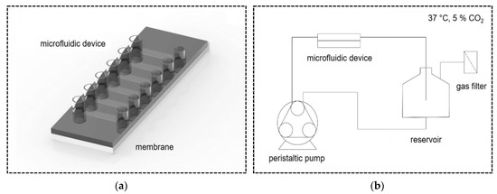 Dynamic culture of endothelial cells in microfluidic slides with (a): Microfluidic device with membrane mounted to the bottom side and six working channels; and (b): Bioreactor system with peristaltic pump and medium reservoir placed in a controlled atmosphere (37 °C, 5% CO2).