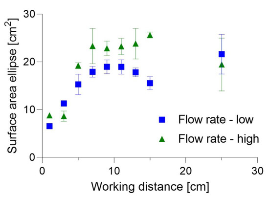 Mean surface area of the sprayed ellipse. Comparison of high and low spraying flow rate.