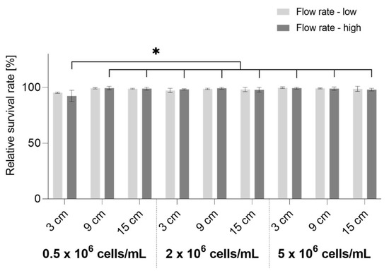 Relative survival rates of sprayed HUVECs (n = 3) for high or low spraying flow rate, cell concentrations and working distances (3 cm, 9 cm, and 15 cm). Differences with p < 0.05 were considered significant and are marked with *.