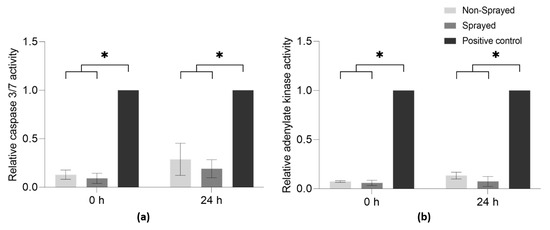 Apoptosis and necrosis of HUVECs (n = 3) after aerosolization. Non-sprayed cells served as a control. (a): Apoptosis was analyzed directly after and 24 h after spraying by caspase 3/7 activity and normalized to a staurosporine-incubated control; (b): Necrosis was evaluated directly after and as 24 h after spraying by adenylate kinase activity and normalized to a 100%-lysis control. Significant differences (p < 0.05) are marked with *.