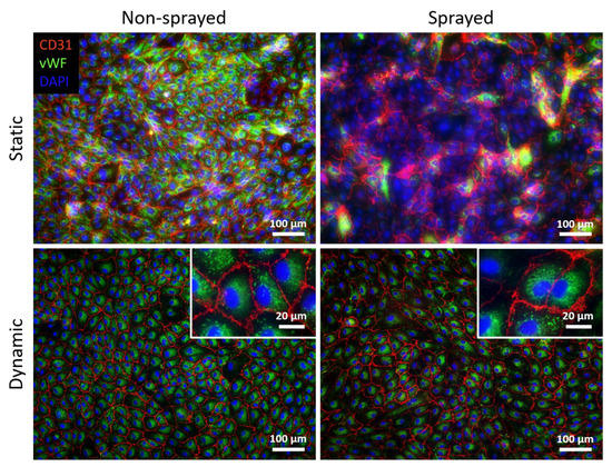 Immunocytochemical staining of non-sprayed and sprayed HUVECs after static and dynamic cultivation with WSS of 5 dyn/cm2 against CD31 (red) and von Willebrand factor (vWF, green). DAPI (blue)-stained cell nuclei. Representative pictures are shown.
