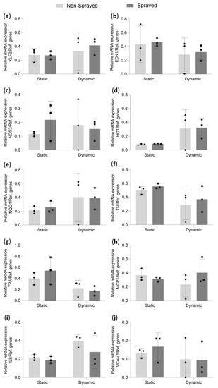Relative mRNA expression in HUVECs (n = 3) after aerosolization in static and dynamic conditions with WSS of 5 dyn/cm2 with non-sprayed cells serving as a control. HUVECs were analyzed for relative mRNA expression of (a): Krüppel-like factor 2 (KLF2); (b): Endothelin 1 (EDN1); (c): Nitric oxide synthase 3 (NOS3); (d): Heme oxygenase 1 gene (HO1); (e): NAD(P)H quinone dehydrogenase 1 (NQO1); (f): Thrombomodulin (TM); (g): Tissue plasminogen activator (TPA); (h): Monocyte Chemoattractant Protein-1 (MCP1); (i): Interleukin 8 (IL8); (j): Vascular cell adhesion molecule 1 (VCAM1) in relation to a reference gene index consisting of GAPDH and TBP. Data are shown as mean ± SD and as black dots and squares representing the individual data points.