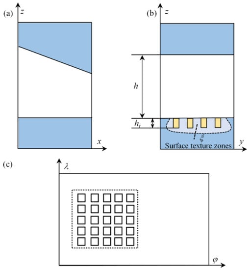 Figure 2a,b represent the schematic diagram of the lubricant film in the smooth state. In the figure, h indicates the lubricant film thickness in the smooth state, and ht indicates the amount of change in film thickness caused by the weave depth, and the ratio of ht to radius gap c is defined as the dimensionless texture depth ht. If the lubricant film thickness is expanded along the maximum film thickness, its two-dimensional view is shown in Figure 2c, where the square textures are all sequentially arranged in the lubricant film pressure ramping area.