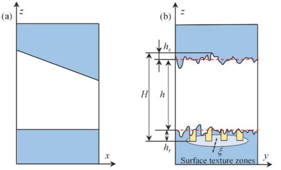 Figure 3 shows the microscopic diagram of the film existing in the bearing gap after adding longitudinal roughness. In this model, the roughness is assumed to have the form of long, narrow ridges and valleys running in the direction of sliding, and the x-direction is considered smooth. As shown in Figure 3a, the longitudinal direction contains the roughness that conforms to the Gaussian distribution. Ra and ht essentially belong to the surface morphology, ht belongs to the local roughness, and Ra is a global surface morphology; both will have an impact on the oil film thickness, then the Ra rough peak caused by the lubricant film thickness change recorded as hs, such as Figure 3b, coupled roughness of the texture structured bearing actual lubricant film thickness for H.
