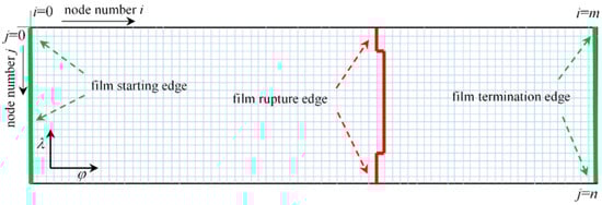 Figure 5 shows the mesh division of the bearing film. The film is expanded in the circumferential direction starting from the maximum thickness and divided into n grids along the axial direction, and the divided grids are numbered with j(j = 0~n), since λ the axial direction is indicated. The circumferential grid is uniformly divided into m cells, and each grid number is denoted by i(i = 0~m), since φ the circumferential direction is indicated. The step length per cell is: Δλ = 2/n; Δφ = (φ – φ)/n.