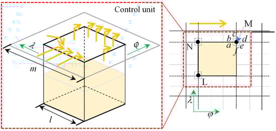 Figure 7 shows the flow balance principle in the textured area. For textured bearing, considering the existence of step change in film at the texture, the film thickness abrupt change in the differential method is to be considered separately. Because the density of the divided grid is large and the weaving region does not completely overlap, the grid intersection must be on the texture, so the relationship between the flow balance at the abrupt change in film can be handled, and the λ and φ directions have a step change in film thickness. The density of micro-pits at a certain defined area is characterized by the micro-pit area rate s, which refers to the ratio of the circumferential cross-sectional area of a single micro-pit to the area of the control cell. The control cell is a virtual square (dashed line in the figure) enclosed by the midpoints of the spacing of adjacent micro-pits, e.g., the area ratio of a square micro-pit is s = (a/m)2, where the control cell side length is m and the side length of a square micro-pit is a.