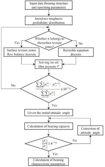 Figure 8 shows the flow chart for the numerical solution of the bearing characteristics. The Reynolds equation is solved by programming in C language. It is necessary to determine whether any point in the film belongs to the texture region and then proceed to the next step of calculation. When the convergence condition is satisfied, the bearing characteristic parameters are output.