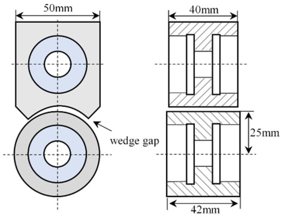 Figure 9 shows the structural parameters of the bearing friction pair. In order to facilitate the frictional wear test, the frictional subassembly of the sliding bearing is simplified, and the lubricant fills the minimum oil film thickness between the friction pairs. The bearing material is 42CrMo; 42CrMo is an ultra-high strength steel with high strength and toughness, and the sliding bearings made of this material are widely used in high-speed and heavy-duty rotating instruments. The test piece tested had a bearing radius of 25 mm, a shingle width of 40 mm, and a bearing width of 42 mm. the bearing surfaces are ground and finished to obtain test pieces with roughness contours on the surface, the initial gap size is adjusted to simulate a given eccentricity, and the eccentricity is changed by manual loading.