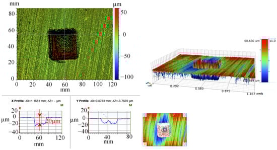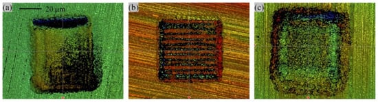Figure 12 shows the three-dimensional shape of laser etching at a depth of 5 μm. Due to the limitations of the laser marking machine, laser etching does not work well at shallow texture depths. Figure 12a shows the surface texture at low power, where the molten metal rapidly condenses and accumulates inside the texture, and the actual depth does not reach 5 μm. Figure 12b shows the surface texture at low laser filling density, where the bottom contour of the texture forms a striated profile along the laser path. The surface fabric in Figure 12b shows a less dense laser filling, where the bottom profile of the fabric forms a striated profile along the laser path. Figure 12c shows a more dense laser filling, where the inner wall of the fabric is depressed and the bottom of the fabric forms a “volcanic” protrusion.