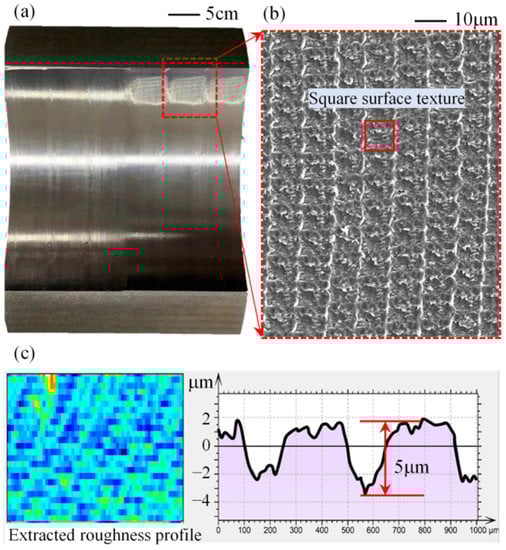 (3) The laser etching process can produce a 20 μm square texture by changing the power level of the equipment to control the depth of the microfabrication. The surface texture can be prepared by a ultrasonic vibration milling process, and the surface shape with less of a roughness and uniform roughness profile can be obtained by changing the processing parameters, and the square textured surface of 5 μm can be obtained;
