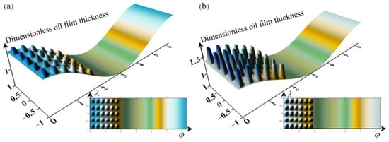 The bearing parameters used in this calculation are shown in Table 1. The bearing characteristics were calculated and analyzed with a texture percentage of 36%. Figure 17 shows the film development of the textured bearing film, and Figure 17a,b shows the film thickness distribution for the textured depth of 5 μm and 20 μm, respectively. As the flow inside the surface texture is always kept in equilibrium, the film caused by the change in texture depth is peaked and increases with the depth of the texture, and the bearing capacity of the oil film adhering to the inner wall of the texture is reduced, so that the film becomes slender.