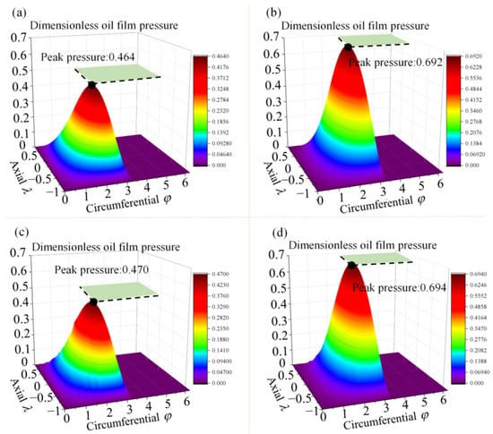 Figure 18 shows the comparison of film pressure considering each factor of surface topography. Figure 18a–d show the pressure distribution of film under the same working condition for bearings with a smooth surface, bearings with only roughness on the surface, bearings with only texture on the surface, and bearings with both roughness and texture on the surface, respectively. The peak dimensionless pressure in the figure is 0.464 for the smooth state and 0.470 for the textured bearing. The presence of the textured structure increases the film thickness, and thus the oil film pressure, so the most pressure peak is increased by 50% after coupling the two surface morphologies.