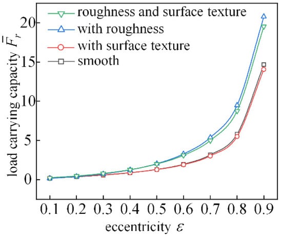 Figure 19 shows the trend of dimensionless bearing capacity with increasing eccentricity. When roughness is not considered, the surface texture with an eccentricity of 0.1~0.5 and depth of 10 μm has little effect on bearing load capacity. When the eccentricity is greater than 0.6, the bearing load capacity of the fabricated bearing decreases slightly. When the eccentricity is greater than 0.2, the bearing capacity is improved by considering the effect of roughness. Since the rough peaks on the shaft and shingle surfaces have a certain ability to trap lubricant, consideration of roughness will result in an increase in the load carrying capacity of the textured bearing.