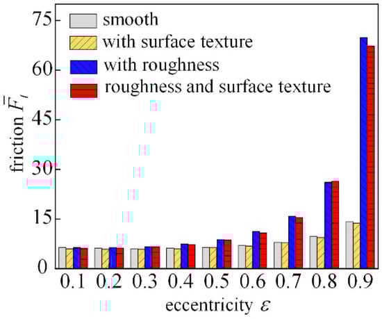 Figure 20 shows the trend of dimensionless friction with increasing eccentricity. With small eccentricity under the account of surface roughness, bearing friction increases, and the larger the eccentricity, the more obvious the increase; the introduction of the texture of the texture can effectively reduce bearing friction. When the eccentricity is 0.9, the roughness and surface textures are introduced and the bearing friction increases significantly, indicating that the presence of textures and surface roughness under large eccentricity is not conducive to the bearing reducing friction.