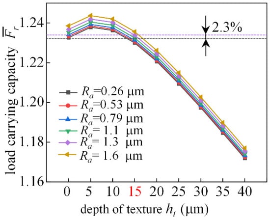 As shown in Figure 21, at 0.4 eccentricity, the preparation of a certain regular texture on the surface of the frictional subsets of the dynamic bearing can lead to an increase in the dimensionless load carrying capacity, and the depth of the texture is 5 μm, which has the best effect on the load capacity improvement. Compared to bearings without texture, the load capacity can be increased by 2.3% at a texture depth of 15 μm and Ra = 1.3 μm. When the depth of the texture is greater than 15 μm, the presence of the texture has a negative effect on the dimensionless bearing capacity. If the joint effect of roughness and texture is considered and the roughness Ra = 0.26 μm (C = 0.01) is taken into account, the valley formed between its roughness peaks has a weak interception effect on the lubricant, and the dimensionless bearing capacity can be improved. The greater the value of roughness, the greater the increase in dimensionless bearing capacity.