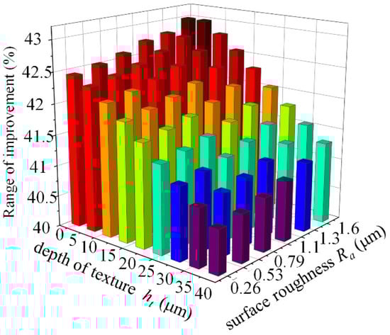 Figure 22 shows the percentage increase in dimensionless load capacity due to the combined effect of roughness and surface texture for an eccentricity of 0.4. Compared with the dynamic pressure bearing without considering the surface roughness, if coupling the two surface morphologies of texture and roughness, the dimensionless load capacity improvement percentage is shown in the figure. Considering the effect of surface roughness, the dimensionless load capacity can be increased by up to 43% as the roughness increases. The improvement of dimensionless bearing capacity gradually decreases in the range of textured depth from ht = 5 μm to ht = 40 μm, but the smallest (ht = 40 μm, Ra = 0.26 μm) also has an improvement of 40.5% in order to optimize the surface roughness and surface texture for load-bearing capacity enhancement, as shown in the dark red and red and yellow areas on the way. During the processing of the textured bearings, the optimum depth of the prepared textures is ht = 5 μm to ht = 20 μm within a reasonable roughness range, as it is not possible to precisely control the surface roughness values.