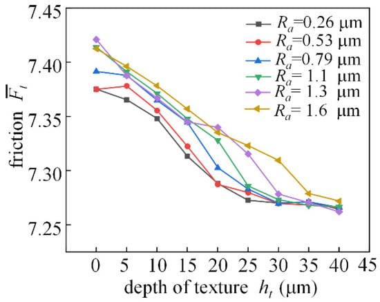 Figure 23 shows the trend of dimensionless friction for different depths of textured bearings with different roughness. When the eccentricity is 0.4, the trend of dimensionless friction decreases visually with increasing weave depth from 0 to 40 μm. Influenced by the roughness, the reduction rate of the dimensionless friction is not the same when the depth of the texture is different.