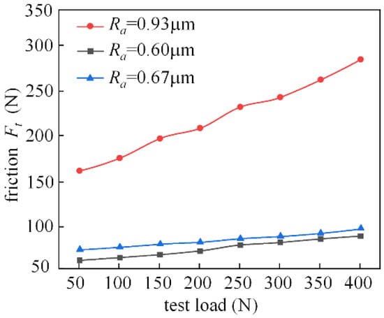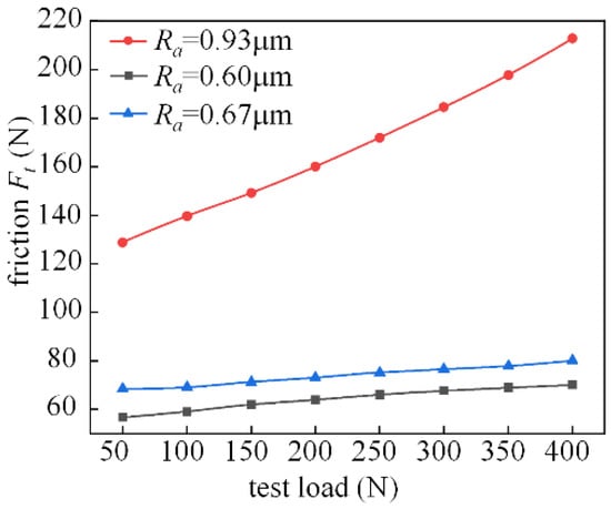 Figure 24 shows the experimental analysis of the friction characteristics of the M2000 tester at 200 r/min for test pieces with different surface roughness. Under this condition, the friction force changes more smoothly in the range of 0.6–0.7 for roughness Ra. When the surface roughness reaches 0.93 μm, the friction force increases significantly with the increasing load. Overall, the coefficient of friction also increases with Ra.