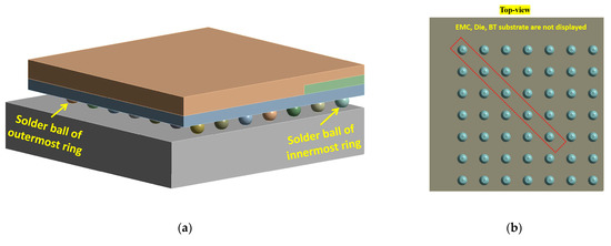 - Pham, V.L.; Xu, J.; Pan, K.; Wang, J.; Park, S.; Singh, C.; Wang, H. Investigation of underfilling BGAs packages-Thermal fatigue. In Proceedings of the 70th IEEE Electronic Components and Technology Conference, Orlando, FL, USA, 3–30 June 2020; IEEE: Piscataway, NJ, USA, 2020; pp. 2252–2258. [Google Scholar] [CrossRef]
