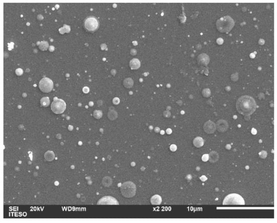 In Figure 3, a typical film surface micrograph from PLD of Bi and Te targets is shown. According to Dauscher et al. [15], different types of particulates may be observed when depositing Bi2Te3 with PLD, originating from target surface roughening as it has already been reported [27,28] and identified as defects produced due the laser irradiation (thermal and mechanical shocks). This is the well-known splashing phenomenon, one of the greatest disadvantages of the PLD technique. As discussed below, the EDS study confirms the presence of elemental Bi and Te at the surface of the films resulting from splashing of individual targets. Nevertheless, the surface of the films that is free from particulates appears to be dense and smooth.