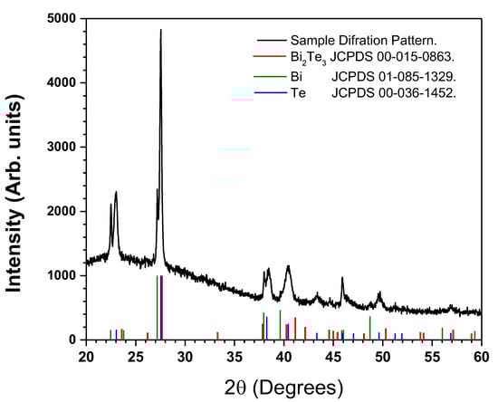 In Figure 5, the diffraction pattern obtained from a polycrystalline thin film deposited by the simultaneous ablation of Bi and Te targets is exhibited. The colored lines represent the reference standards for Bi2Te3 (red), Bi (green), and Te (blue) structures, according to the JCPDS-ICDD files 00-015-0863, 01-085-1329, and 00-036-1452, respectively. Depending on the film deposition technique, the intensity of the peaks may vary [27]; however, the preferred growth plane of all Bi2Te3 is shown at the (0 1 5) plane, around to 27.54°. A characteristic peak of films prepared by PLD is shown at the (0 0 6) plane, confirming that it is feasible to obtain at room temperature a film with a higher degree of crystallinity, in comparison with other deposition methods [29,30]. Note that the appearance of signals corresponding to elemental Bi and Te confirms the presence of splashing at the surface of the films, which is in accordance with SEM and EDS discussions. Crystallite size for Bi2Te3 was calculated using the Scherrer equation as ~55 nm, which is in good agreement with the Takashiri report [31], in which Bi2Te2.7S0.3 was synthesized by means of the flash evaporation method. According to their discussion, nanocrystalline thin films based on bismuth telluride can potentially have improved thermoelectric responses due to quantum effects arising from size reduction. Therefore, obtaining small grain size (less than 200 nm) in bismuth telluride thin films is important for a possible application on thermoelectric devices with improved figure of merit [31,32,33]. Nevertheless, the present work is mainly focused on the synthesis method and the resulting structural, morphological, and chemical composition of the thin films.