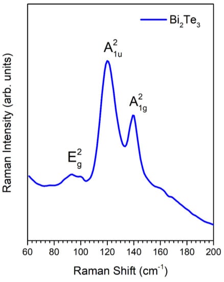A typical Raman spectrum of a synthesized Bi2Te3 thin film is shown in Figure 6. The presence of signals centered at 94, 120, and 139 cm−1, assigned to the E g 2 , A 1 u 2 , and A 1 g 2 (LO) vibrational modes, respectively, corresponding to the rhombohedral-structured Bi2Te3, which are consistent with reports in the literature [31,32,33,34] and the XRD analysis.