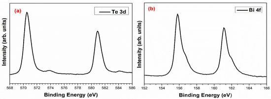 Figure 7 shows the XPS spectra of the Bi2Te3. The Te spectrum, Figure 6a, shows two sets of peaks at 570.82 and 580.94 eV, which correspond to Te−2 3d5/2 and Te−2 3d3/2. It also has small peaks at 573.88 and 584.11 eV due to surface oxidation. A previous study reported that nanostructured materials are more easily oxidized [35,36,37]. Figure 6b shows the high-resolution scan of Bi 4f doublet peaks centered at 155.78 eV and 161.10 eV, corresponding to Bi+3 4f7/2 and Bi+3 4f5/2, respectively, confirming the formation of the Bi2Te3 phase [37,38,39,40].