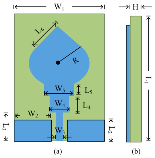 Structure of suggested ultra-wideband antenna design: (a) front view (b) side view.