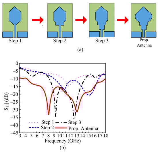 In order to obtain the required antenna characteristics, various design steps were carried out to obtain the final proposed antenna geometry operating at ultra-wideband. In the first step, the hexagonal patch antenna with CPW feedline was designed for the central frequency of 12 GHz. The antenna has operational bandwidth of 2 GHz covering 11–13 GHz. In the second step, the rectangular stub was added between the radiating patch and the feedline. The addition of this stub increases the electrical length of the antenna, which results in an improvement in return loss and bandwidth. The antenna starts operating at 11 GHz and 15 GHz with a return loss of less than 15 dB. In the third step, another rectangular stub was added below the existing stub, as shown in Figure 2a, which results in the S-parameter of the proposed antenna becoming stable and showing dual resonances at 9.5 GHz and 13 GHz. The antenna has operational bandwidth <−10 dB at 7.5–14.5 GHz with return loss <−35 dB, as shown in Figure 2b. In the final stage, two circular stubs of radius 5 mm were loaded on both sides of the central patch. As a result, the operational bandwidth of the antenna improves from 3 GHz to 8 GHz. The resultant antenna resonates at 7.5 GHz and 13 GHz with a bandwidth of 15 GHz ranging from 3–18 GHz, as depicted in Figure 2a,b.