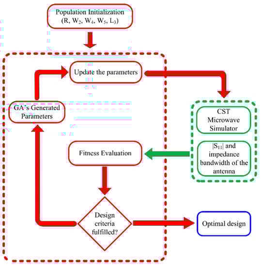 A genetic algorithm (GA) was used in collaboration with the full-wave modeling tool (CST MWS) to improve the characteristics of the UWB antenna. Genetic algorithm optimizers, as is well known, are robust stochastic search techniques based on the ideas and concepts of natural selection and evolution. The optimization was completed quickly and efficiently by identifying design goals for a UWB impedance bandwidth with a low |S11| and identifying the antenna parameters R, W2, W4, W5, and L3. Refs. [39,40,41] have more information on the GA in antenna optimization. Figure 3 depicts the flowchart of the suggested optimization procedure.