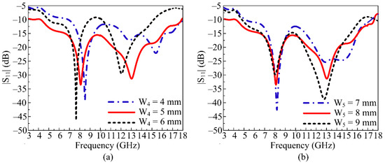 To obtain the final geometry of the proposed UWB antenna, various design steps (as discussed above) as well as parametric analysis of important and key parameters were performed. The parametric analysis of rectangular stubs W4 and W5 is discussed in this section. The length of the lower rectangular stub (W4) was analyzed to observe the impact on the |S11| characteristic. At its optimal value of W4 = 5 mm, the proposed antenna offers a wideband of 5–17 GHz with resonant frequencies of 8 GHz and 13 GHz. When the value of W4 is fixed at 4 mm, the proposed antenna’s bandwidth is reduced to a dual band of 7.5–9.5 GHz and 12–17 GHz. Similarly, when the value is increased to 6 mm, again in the dual band, a slight shift towards the left side is noticed, as given in Figure 4a. The antenna offers dual frequencies ranging from 6.5–8 GHz and 11–14 GHz.