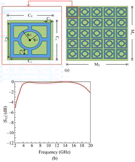 (a) Structure of proposed frequency selective surface (FSS) and unit cell dimensions; (b) |S12| property of suggested FSS unit cell.