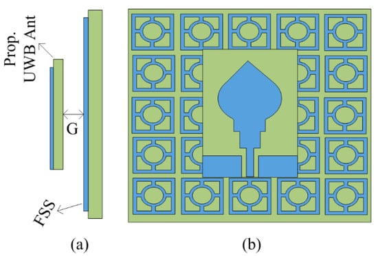 Frequency selective surface-loaded UWB antenna: (a) side view; (b) top view (G = 9 mm).