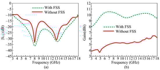 (a) Simulated |S11| plot of suggested antenna with and without FSS; (b) predicated gain of suggested antenna with and without FSS.