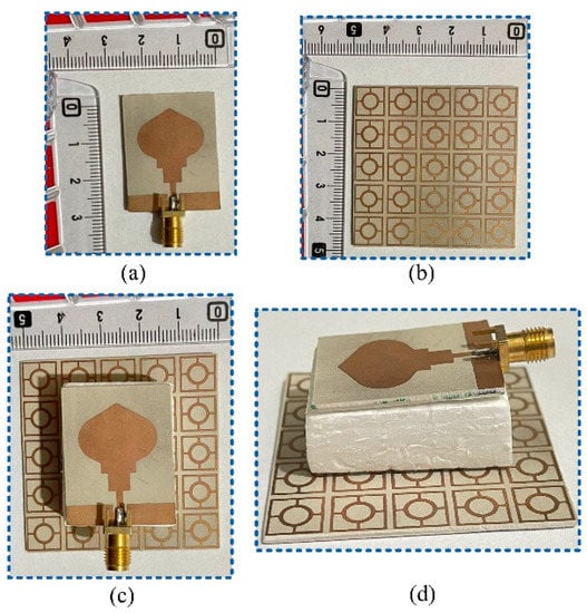 Fabricated prototype of (a) UWB antenna; (b) FSS design; (c) antenna placed at FSS layer; (d) side view of antenna placed over FSS layer.