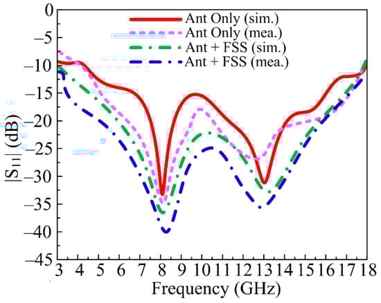 In Figure 9, the contrast between the prototyped measured and software simulated scattering parameters of the suggested antenna is provided with and without FSS. The antenna offers a wideband of 12 GHz ranging from 5–17 GHz without FSS, with a resonance frequency of 8 GHz and 13.25 GHz. Meanwhile, the FSS-loaded antenna offers a wide bandwidth of 15 GHz ranging from 3–18 GHz, with resonances at 8 GHz and 13.5 GHz, as given in Figure 9. The proposed UWB antenna with and without FSS shows good agreement between measured and simulated results.