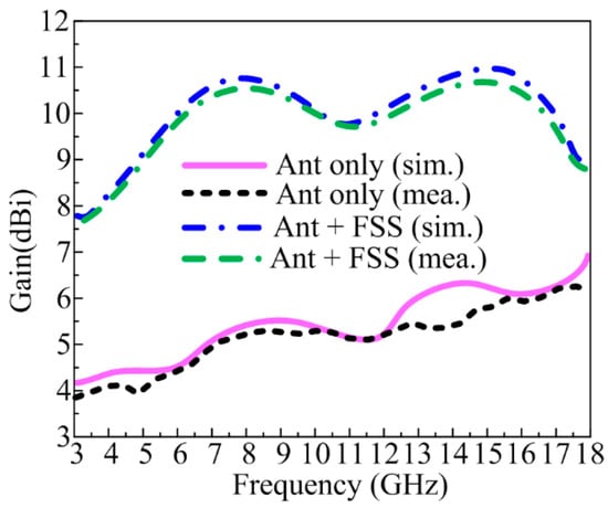 The recommended UWB antenna’s gain versus frequency plot, either with or without FSS, is displayed in Figure 10. The suggested antenna offers a gain >5 dBi at the functional band, with a peak gain value of around 6 dBi at the resonance frequency of 13 GHz, which can be seen in Figure 10. The gain of the FSS-loaded UWB antenna was enhanced by approximately 5.5 to 6 dBi. With a peak value of 10.75 dBi and 11 dBi at resonance frequencies of 8 GHz and 13.5 GHz, respectively, the antenna with an FSS layer delivers a gain > 10 dBi at operational bandwidth, as shown in Figure 10. It is also obvious from the illustration that there are no significant disparities between the measured results and the predicted results.