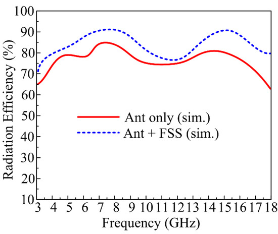 The radiation efficiency of the suggested UWB antenna is given in Figure 11. The antenna offers radiation efficiency >75% in operational bandwidth with peak values of 83% and 82% at resonance frequencies of 7.5 GHz and 14.5 GHz, respectively. After loading the FSS layer, a slight improvement in radiation efficiency is observed. The antenna loaded with FSS offers radiation efficiency >78% at operational bandwidth with peak values of 90% at 8 GHz and 88% at 13.5 GHz.